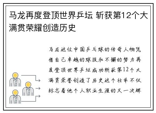 马龙,这位中国乒乓球的传奇人物,凭借自己卓越的球技和不懈的努力,再度登顶世界乒坛,成功斩获第12个大满贯荣誉,创造了历史。这个壮举不仅标志着他个人职业生涯的又一次辉煌,也为中国乒乓球增添了浓墨重彩的一...