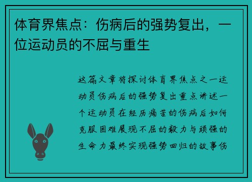这篇文章将探讨体育界焦点之一——运动员伤病后的强势复出,重点讲述一个运动员在经历痛苦的伤病后,如何克服困难,展现不屈的毅力与顽强的生命力,最终实现强势回归的故事。伤病不仅让运动员面临身体上的巨大挑战,...