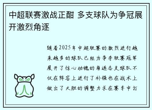 随着2025年中超联赛的激烈进行,越来越多的球队已经为争夺联赛冠军展开了惊心动魄的角逐。各支球队不仅在阵容上进行了补强,也在战术上做出了大胆的调整,力求在赛季中打出最好的成绩。无论是传统豪门,还是新兴...