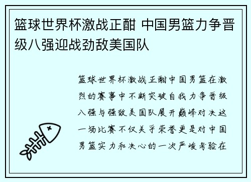 篮球世界杯激战正酣,中国男篮在激烈的赛事中不断突破自我,力争晋级八强,与强敌美国队展开巅峰对决。这一场比赛不仅关乎荣誉,更是对中国男篮实力和决心的一次严峻考验。在本届篮球世界杯中,中国男篮展现出了积极...