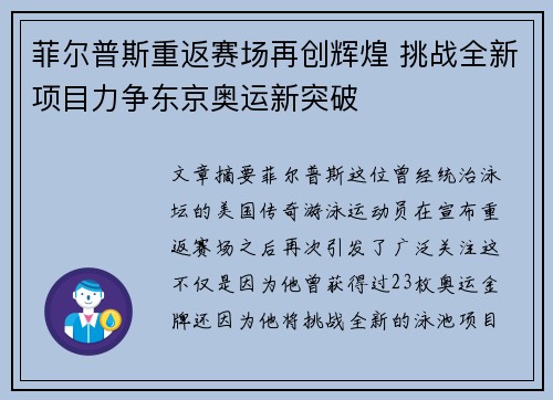 文章摘要:菲尔普斯,这位曾经统治泳坛的美国传奇游泳运动员,在宣布重返赛场之后,再次引发了广泛关注。这不仅是因为他曾获得过23枚奥运金牌,还因为他将挑战全新的泳池项目,并力争在东京奥运会中实现个人的新突...