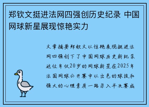文章摘要:郑钦文以惊艳表现挺进法网四强,创下了中国网球历史新纪录。这位年仅20岁的网球新星在2025年法国网球公开赛中,以出色的球技和强大的心理素质一路杀入半决赛,成为历史上最年轻的中国女网球运动员之...