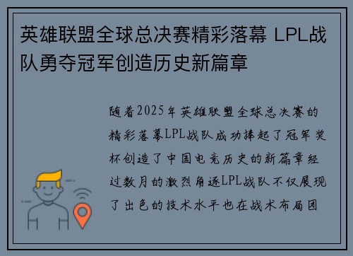 • 英雄联盟全球总决赛精彩落幕 LPL战队勇夺冠军创造历史新篇章
