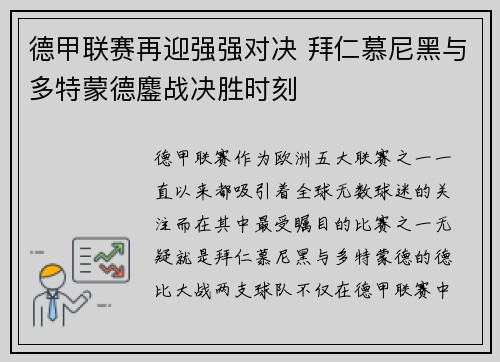 • 德甲联赛再迎强强对决 拜仁慕尼黑与多特蒙德鏖战决胜时刻