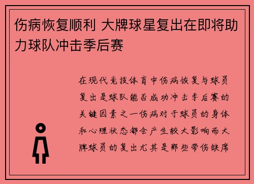 在现代竞技体育中,伤病恢复与球员复出是球队能否成功冲击季后赛的关键因素之一。伤病对于球员的身体和心理状态都会产生较大影响,而大牌球员的复出,尤其是那些带伤缺席的明星球员,往往成为球队在关键时刻扭转局势...