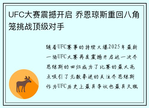 随着UFC赛事的持续火爆,2025年最新一场UFC大赛再度震撼开启。这一次,乔恩·琼斯的回归成为了比赛的最大亮点,吸引了无数拳迷的关注。乔恩·琼斯,作为UFC历史上最具争议也最具天赋的选手之一,已然成...