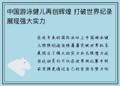 • 中国游泳健儿再创辉煌 打破世界纪录展现强大实力
