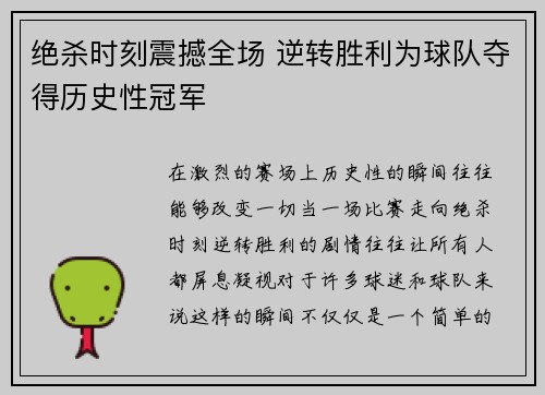 • 绝杀时刻震撼全场 逆转胜利为球队夺得历史性冠军
