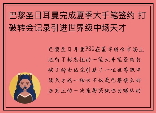 巴黎圣日耳曼(PSG)在夏季转会市场上进行了标志性的一笔大手笔签约,打破了转会记录,引进了一位世界级中场天才。这一转会不仅是巴黎俱乐部历史上的一次重要突破,也为球队的未来发展注入了新的活力和动力。本文...
