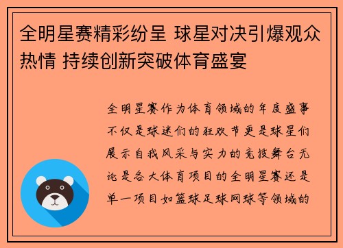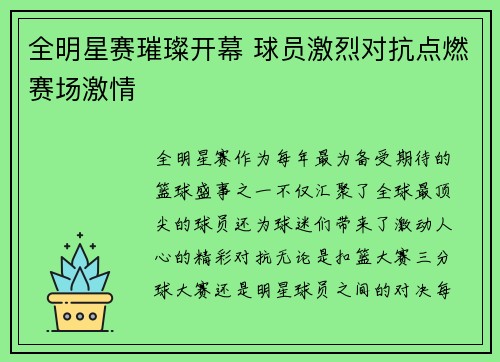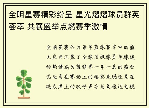 全明星赛作为每年最为备受期待的篮球盛事之一,不仅汇聚了全球最顶尖的球员,还为球迷们带来了激动人心的精彩对抗。无论是扣篮大赛、三分球大赛,还是明星球员之间的对决,每一项赛事都充满了悬念与惊喜。本文将从四...