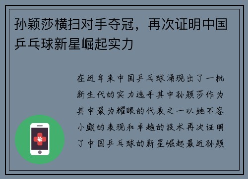 在近年来,中国乒乓球涌现出了一批新生代的实力选手,其中孙颖莎作为其中最为耀眼的代表之一,以她不容小觑的表现和卓越的技术,再次证明了中国乒乓球的新星崛起。最近,孙颖莎在一项国际比赛中以横扫对手的方式成功...