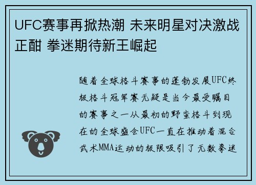 随着全球格斗赛事的蓬勃发展,UFC(终极格斗冠军赛)无疑是当今最受瞩目的赛事之一。从最初的“野蛮格斗”到现在的全球盛会,UFC一直在推动着混合武术(MMA)运动的极限,吸引了无数拳迷的关注。近年来,U...
