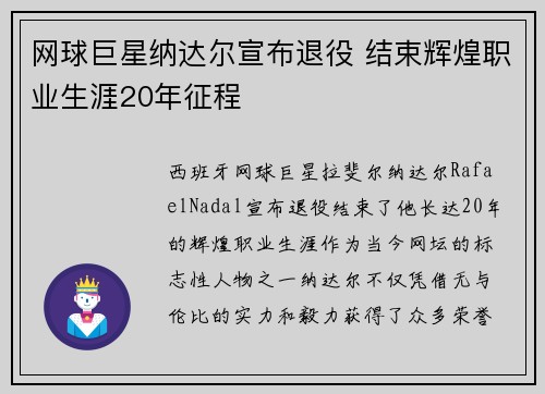 西班牙网球巨星拉斐尔·纳达尔(Rafael Nadal)宣布退役,结束了他长达20年的辉煌职业生涯。作为当今网坛的标志性人物之一,纳达尔不仅凭借无与伦比的实力和毅力获得了众多荣誉,还深刻影响了世界网球...