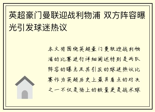 本文将围绕英超豪门曼联迎战利物浦的比赛进行详细阐述,特别是两队阵容的曝光及其引发的球迷热议。比赛作为英超历史上最具看点的对决之一,不仅是场上的较量,更是战术、球员状态、教练决策等多方面因素的较量。阵容...