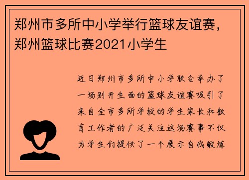 近日,郑州市多所中小学联合举办了一场别开生面的篮球友谊赛,吸引了来自全市多所学校的学生、家长和教育工作者的广泛关注。这场赛事不仅为学生们提供了一个展示自我、锻炼身体的平台,还通过篮球这项充满激情的运动...