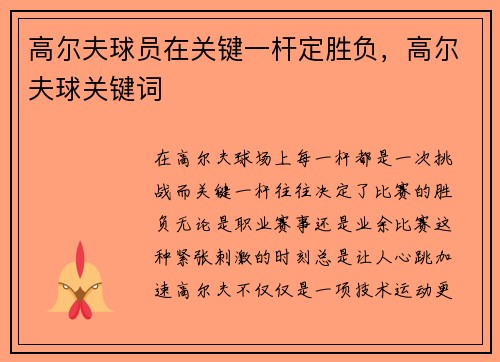 在高尔夫球场上,每一杆都是一次挑战,而关键一杆往往决定了比赛的胜负。无论是职业赛事还是业余比赛,这种紧张刺激的时刻总是让人心跳加速。高尔夫不仅仅是一项技术运动,更是一场心理战。在关键时刻,球员的决策、...