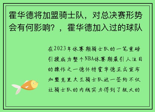 在2023年休赛期,骑士队的一笔重磅引援成为整个NBA休赛期最引人注目的操作之一——德怀特·霍华德正式宣布加盟克里夫兰骑士队。这一签约不仅让骑士队的内线实力得到了极大的提升,也为球队在新赛季的总冠军争...