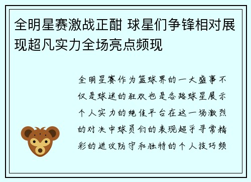 全明星赛作为篮球界的一大盛事,不仅是球迷的狂欢,也是各路球星展示个人实力的绝佳平台。在这一场激烈的对决中,球员们的表现超乎寻常,精彩的进攻、防守和独特的个人技巧频频让人眼前一亮。每一年的全明星赛,都是...