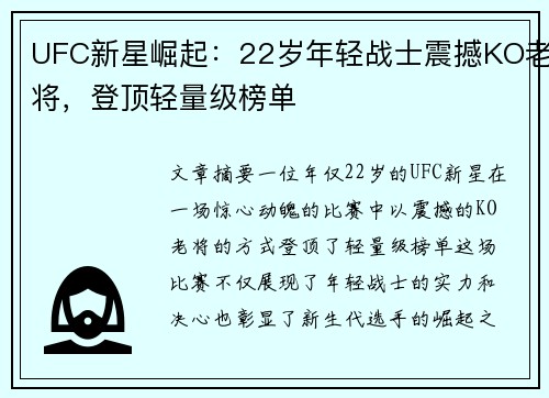 文章摘要:一位年仅22岁的UFC新星在一场惊心动魄的比赛中,以震撼的KO老将的方式登顶了轻量级榜单。这场比赛不仅展现了年轻战士的实力和决心,也彰显了新生代选手的崛起之势。本文将从四个方面对这一轰动事件...