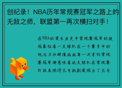 在NBA的漫长历史中,常规赛冠军的桂冠象征着一支球队在一个赛季中的统治力和辉煌成就。每一次拿到常规赛冠军,都意味着这支球队在常规赛阶段表现得无可挑剔,展现出了无与伦比的实力和团队协作。而有些球队更是以...
