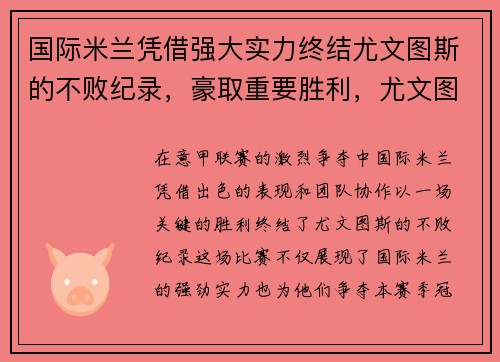 在意甲联赛的激烈争夺中,国际米兰凭借出色的表现和团队协作,以一场关键的胜利终结了尤文图斯的不败纪录。这场比赛不仅展现了国际米兰的强劲实力,也为他们争夺本赛季冠军增添了重要砝码。尤文图斯作为意甲的传统豪...