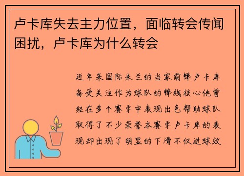 近年来,国际米兰的当家前锋卢卡库备受关注。作为球队的锋线核心,他曾经在多个赛季中表现出色,帮助球队取得了不少荣誉。本赛季卢卡库的表现却出现了明显的下滑,不仅进球效率降低,就连出场时间也在逐渐减少。这让...
