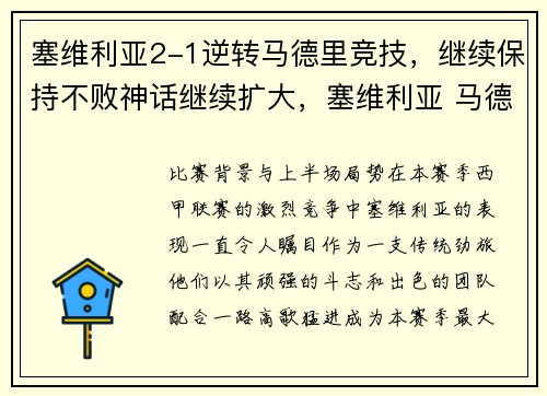 比赛背景与上半场局势 在本赛季西甲联赛的激烈竞争中,塞维利亚的表现一直令人瞩目。作为一支传统劲旅,他们以其顽强的斗志和出色的团队配合,一路高歌猛进,成为本赛季最大的黑马之一。本轮面对同城对手马德里竞技...
