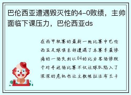 在西甲联赛的最新一轮比赛中,巴伦西亚足球俱乐部遭遇了本赛季最惨痛的一场失利——以0-4的比分客场惨败于对手。这场比赛不仅让球队陷入了深深的危机,也让主教练拉法·布兰卡的帅位变得风雨飘摇。对于一支志在争...