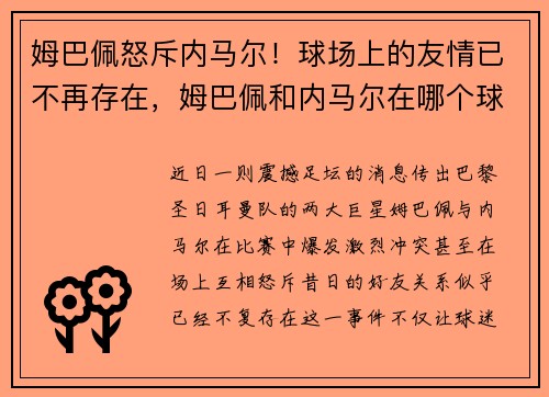 近日,一则震撼足坛的消息传出:巴黎圣日耳曼队的两大巨星姆巴佩与内马尔在比赛中爆发激烈冲突,甚至在场上互相怒斥,昔日的好友关系似乎已经不复存在。这一事件不仅让球迷们感到震惊,也让人们重新审视足坛巨星之间...