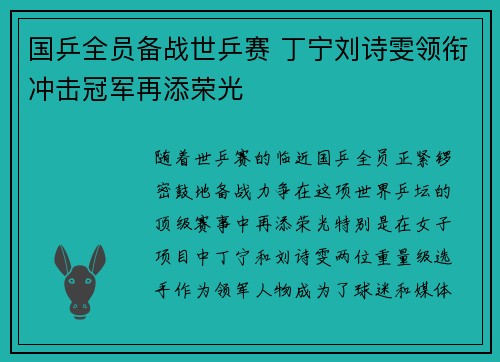 随着世乒赛的临近,国乒全员正紧锣密鼓地备战,力争在这项世界乒坛的顶级赛事中再添荣光。特别是在女子项目中,丁宁和刘诗雯两位重量级选手作为领军人物,成为了球迷和媒体的关注焦点。两位选手不仅在国内赛场上表现...