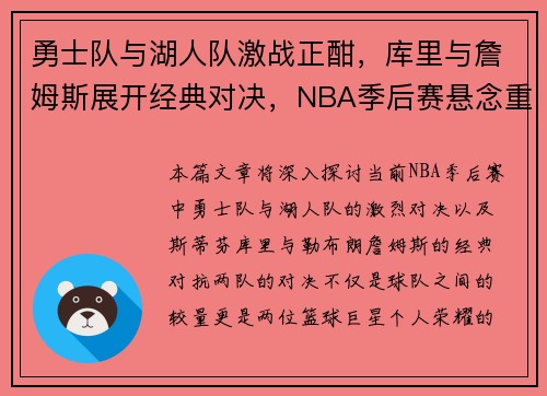 本篇文章将深入探讨当前NBA季后赛中,勇士队与湖人队的激烈对决,以及斯蒂芬·库里与勒布朗·詹姆斯的经典对抗。两队的对决不仅是球队之间的较量,更是两位篮球巨星个人荣耀的竞逐。文章从四个方面详细阐述这一系...