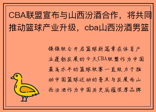强强联合,开启篮球新篇章 在体育产业蓬勃发展的今天,CBA联盟作为中国最高水平的篮球联赛,一直致力于推动中国篮球运动的普及与发展。而山西汾酒,作为中国历史底蕴深厚、品牌影响力卓越的企业,此次与CBA联...