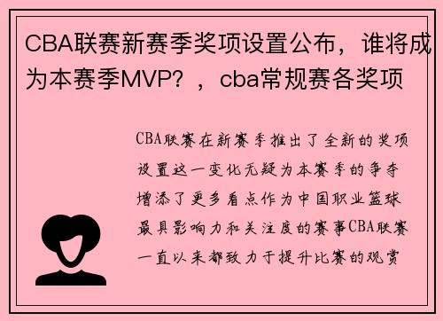 CBA联赛在新赛季推出了全新的奖项设置,这一变化无疑为本赛季的争夺增添了更多看点。作为中国职业篮球最具影响力和关注度的赛事,CBA联赛一直以来都致力于提升比赛的观赏性和球员的竞争性。而新赛季的奖项调整...