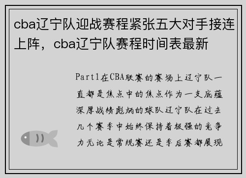 Part1 在CBA联赛的赛场上,辽宁队一直都是焦点中的焦点。作为一支底蕴深厚、战绩彪炳的球队,辽宁队在过去几个赛季中始终保持着极强的竞争力,无论是常规赛还是季后赛,都展现了他们无与伦比的战术素养和技...