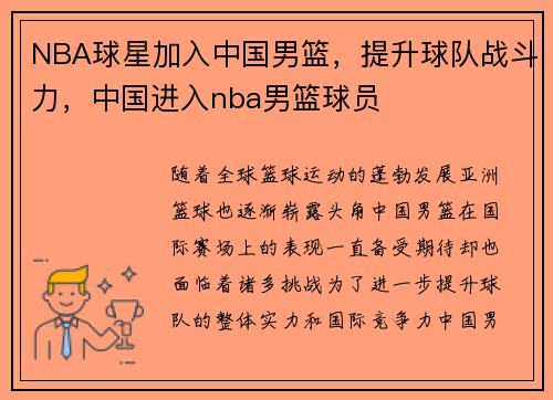 随着全球篮球运动的蓬勃发展,亚洲篮球也逐渐崭露头角。中国男篮在国际赛场上的表现一直备受期待,却也面临着诸多挑战。为了进一步提升球队的整体实力和国际竞争力,中国男篮开始尝试引入NBA级别的球星,这一举措...