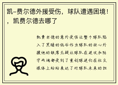 凯-费尔德的意外受伤让整个球队陷入了黑暗的低谷。作为球队的核心外援,他的缺席无疑让球队在进攻和防守两端都受到了重创。球迷们在社交媒体上纷纷表达了对球队未来的担忧,甚至有人开始怀疑这支球队能否在本赛季完...