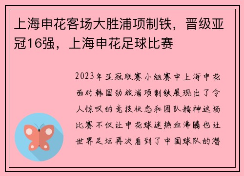 2023年亚冠联赛小组赛中,上海申花面对韩国劲旅浦项制铁,展现出了令人惊叹的竞技状态和团队精神。这场比赛不仅让申花球迷热血沸腾,也让世界足坛再次看到了中国球队的潜力与实力。 比赛一开始,申花便展现出了...