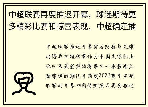 中超联赛推迟开幕背后:防疫与足球的博弈 中超联赛,作为中国足球职业化以来最重要的赛事之一,承载着无数球迷的期待与热爱。2023赛季中超联赛的开幕却因特殊原因再度推迟。这一消息让无数球迷感到遗憾,也引发...