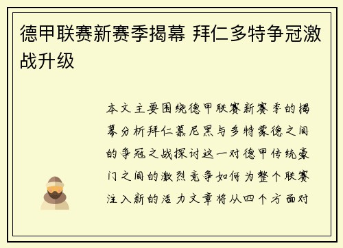 本文主要围绕德甲联赛新赛季的揭幕,分析拜仁慕尼黑与多特蒙德之间的争冠之战,探讨这一对德甲传统豪门之间的激烈竞争如何为整个联赛注入新的活力。文章将从四个方面对德甲新赛季的动态进行深入分析:一是拜仁与多特...