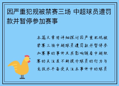 本篇文章将详细探讨因严重犯规被禁赛三场,中超球员遭罚款并暂停参加赛事的事件及其影响。随着中超联赛的关注度不断提升,球员的行为与竞技水平备受关注。本事件中的球员因在比赛中犯规行为严重,不仅被禁赛三场,还...
